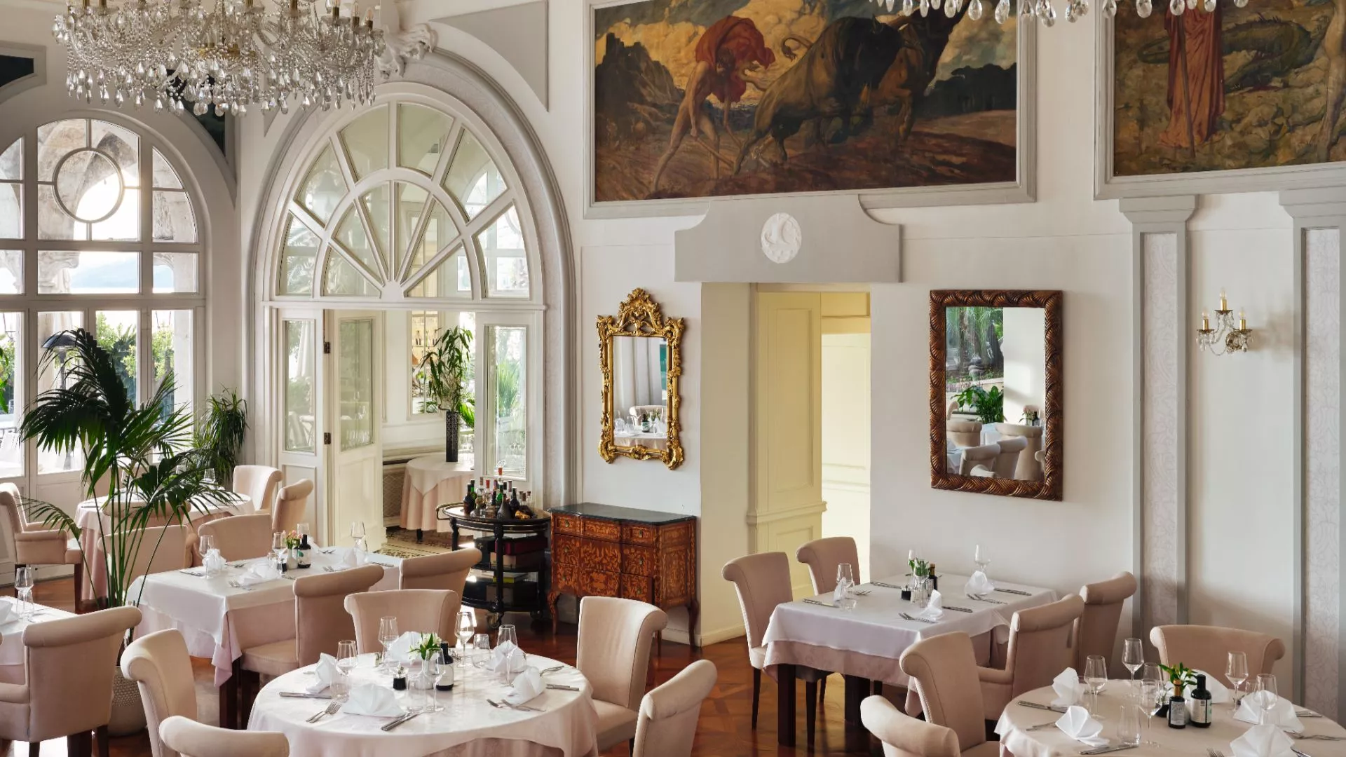 Srce gastronomske ponude Hotela Milenij smješteno je u raskošnoj plesnoj dvorani vile iz 1920-ih, gdje se profinjeni okusi susreću s bezvremenskom elegancijom. Terasa s pogledom na Kvarnerski zaljev uživa u hladu zelenih palmi i svježem morskom povjetarcu, stvarajući poseban doživljaj objedovanja na otvorenom. Unutra, umjetnost preuzima glavnu riječ. Monumentalne freske bečkog slikara Karla Ludwiga Hassmanna, nadahnute mitskim putovanjima Argonauta, odaju počast bogatoj povijesti vile koju je projektirao ugledni arhitekt Carl Seidl. Jelovnik slavi najbolje plodove Jadrana, s naglaskom na svježe ulovljenu ribu i cijenjene kvarnerske škampe.