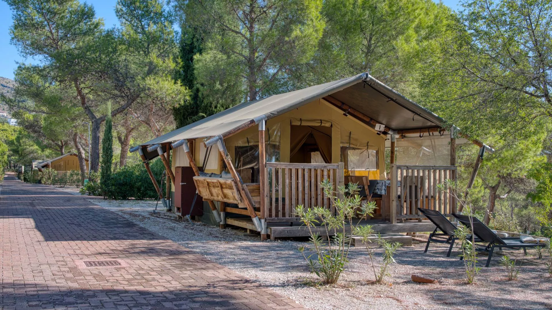Nascoste sotto gli alberi, le Tende Kalahari con due camere offrono un assaggio di avventura avvolto nel comfort. Pensate per famiglie fino a cinque persone, queste tende glamping da 24 m² fondono texture naturali, luce calda e la dolce brezza costiera. All’interno, un letto matrimoniale e un letto a castello con base matrimoniale e letto singolo superiore creano una disposizione pratica e divertente, mentre l’angolo cottura integrato e l’accogliente zona giorno semplificano la vita quotidiana. All’esterno, la terrazza in legno arredata invita a cene all’aperto e serate tranquille circondati dal profumo dei pini e dalla salsedine: una fuga semplice, a contatto con la natura, che regala una vera spensieratezza.