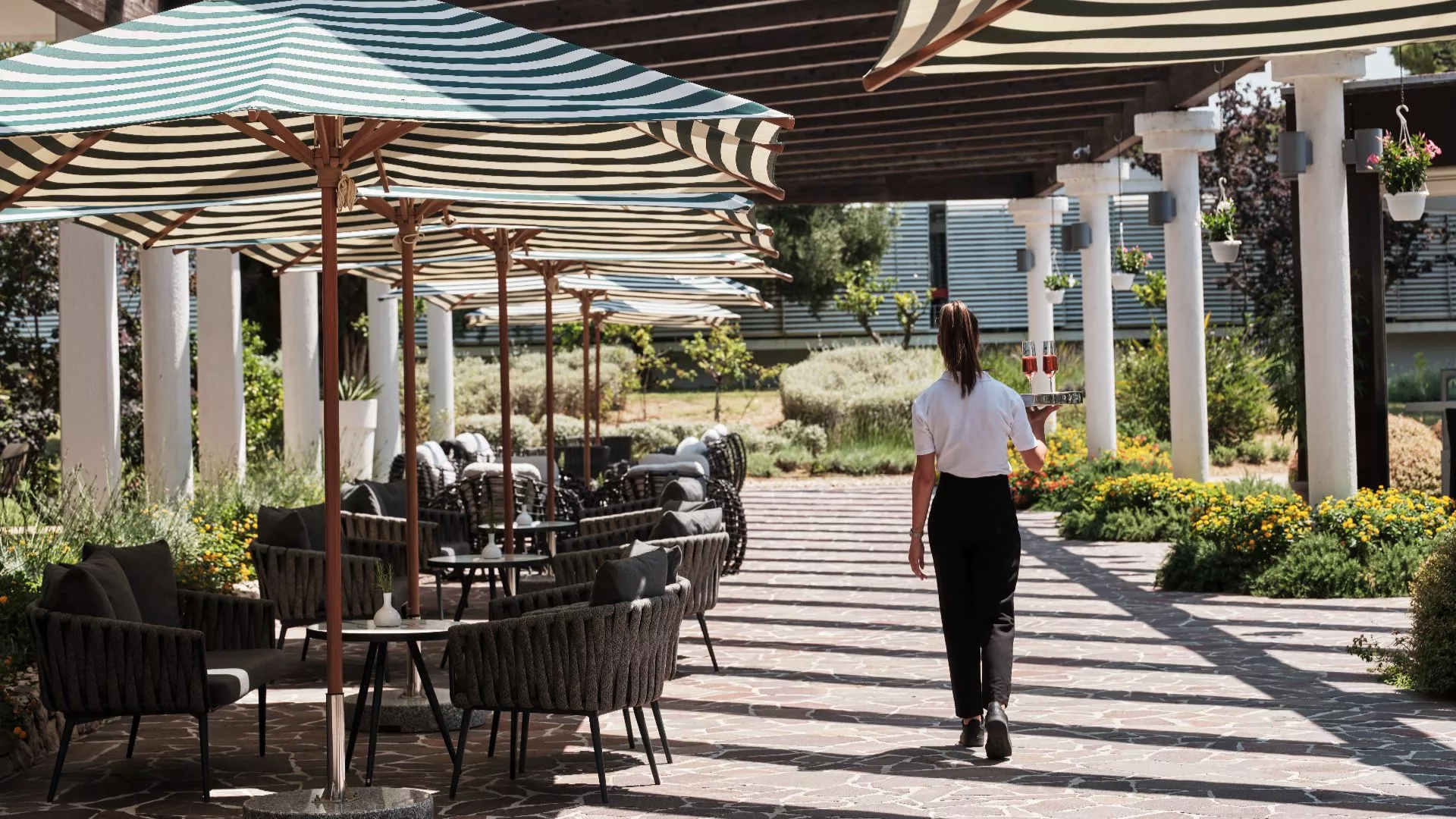 Surrounded by swaying palms and whispering pines, this lounge and aperitif bar feels like a breeze itself. Full-length windows open to the pool and gardens, filling every corner with sunlight. Step onto the stone terrace under timber beams, where greenery hugs each table. Glasses clink with cool cocktails and rich espressos as soft chatter drifts through warm air. Whether sinking into sun-warmed seats or lingering into the night, every moment unfolds naturally—easy, coastal, and wrapped in the scent of pine and salt-kissed air.