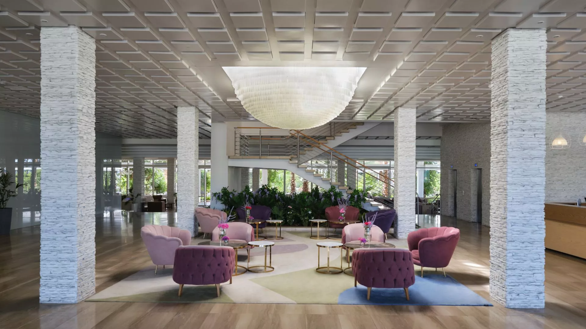 Bright rooms and breezy suites decorated in soft whites and calming lavenders open onto balconies with postcard-perfect views, ideal for slow mornings or dreamy sunsets. By day, sink into relaxation at the outdoor saltwater pool, surrounded by palms and olive trees. Sip cocktails beneath clear blue skies, or wander down to Spa Beach, where sun loungers meet gentle waves.
